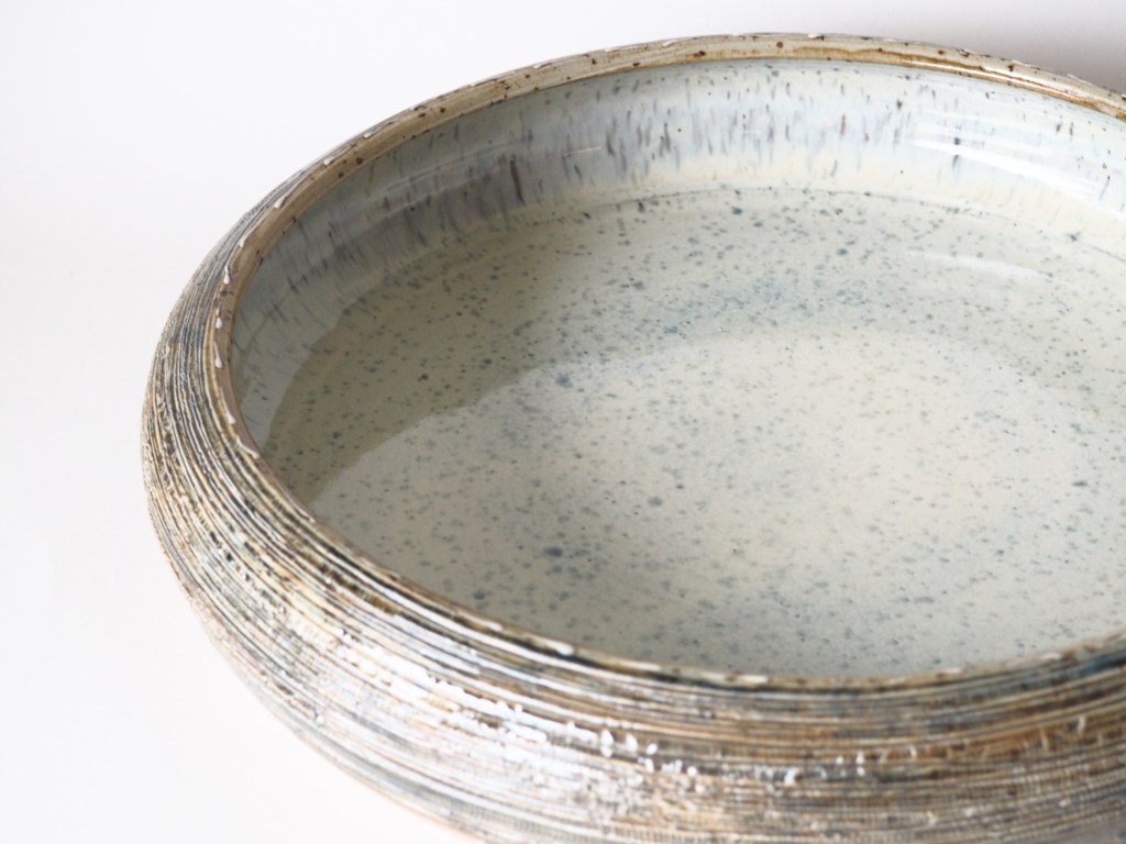 Nadat de vormen zijn gedraaid, laat ik ze drogen tot ‘leerhard’ en begint het proces van afdraaien. Hierna bewerk ik vaak delen van mijn werkstukken met witte of gekleurde engobes en porseleinslib. Ik gebruik vaak de ‘carving’techniek en werk graag met een ringeloor. Daarna laat ik ze drogen tot ze voor de eerste keer ‘biscuit’ kunnen worden gestookt.